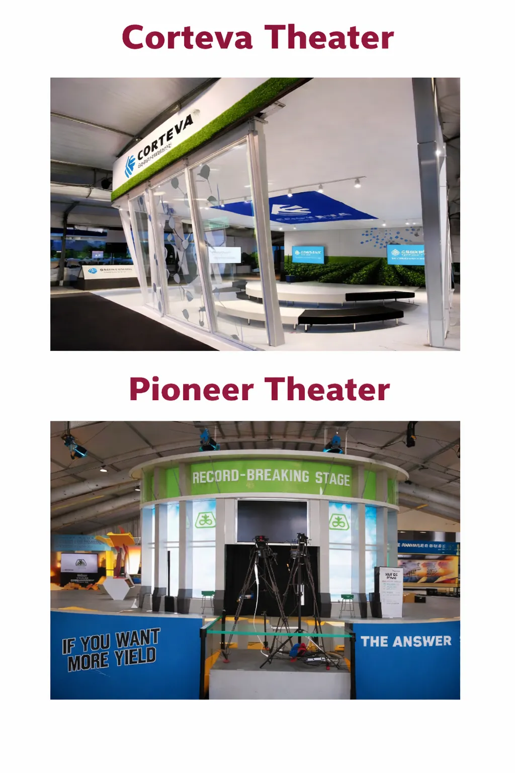 To accommodate the presentations, they enlisted designers with Hamilton Exhibits LLC (creators of the Corteva exhibit) and Coppinger Exhibits Inc. (designers of the Pioneer booth) to prep a 1,600-square-foot theater space in each structure. The theaters featured bench seating along with plenty of overflow space for standing attendees and multiple 90-inch screens showing the live feeds.